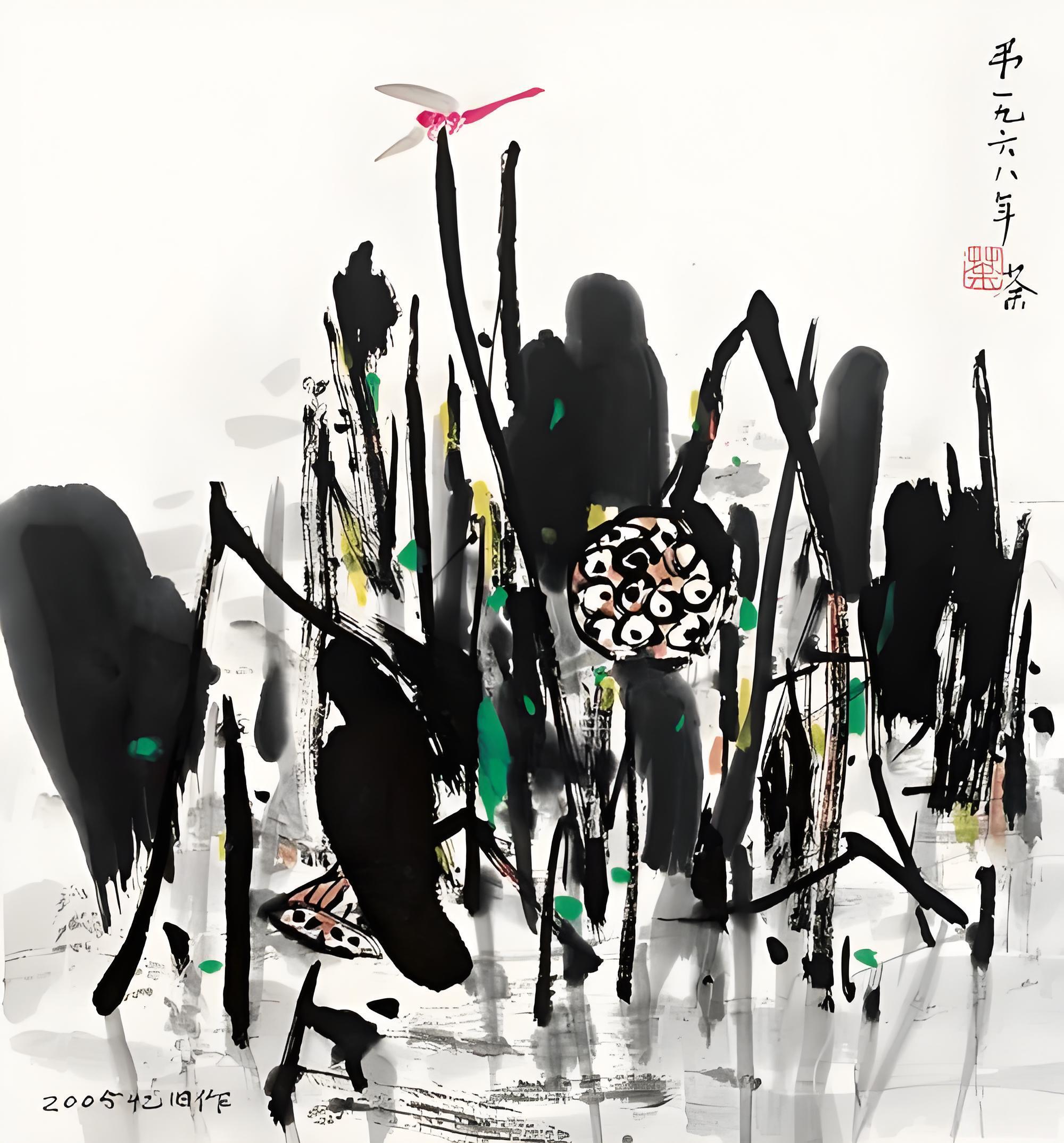 此幅 《红蜻蜓》是回忆旧作之作,旧作为油画,是画家吴冠中回忆起1968年的冬日信步北海,见残荷矗立便幻想有一只猩红的蜻蜓作为唯一的凭吊者栖息之上,但这创作的冲动受到文革压制也如残荷般枯死。1996年他又一连创作油画三幅,但都未达到所追求的的抒情诗境。2005年是画家吴冠中的又一创作黄金期,再次创作《红蜻蜓》以水墨呈现,并加入书法气势,那份萧瑟悲苦的抒情意味更浓。
