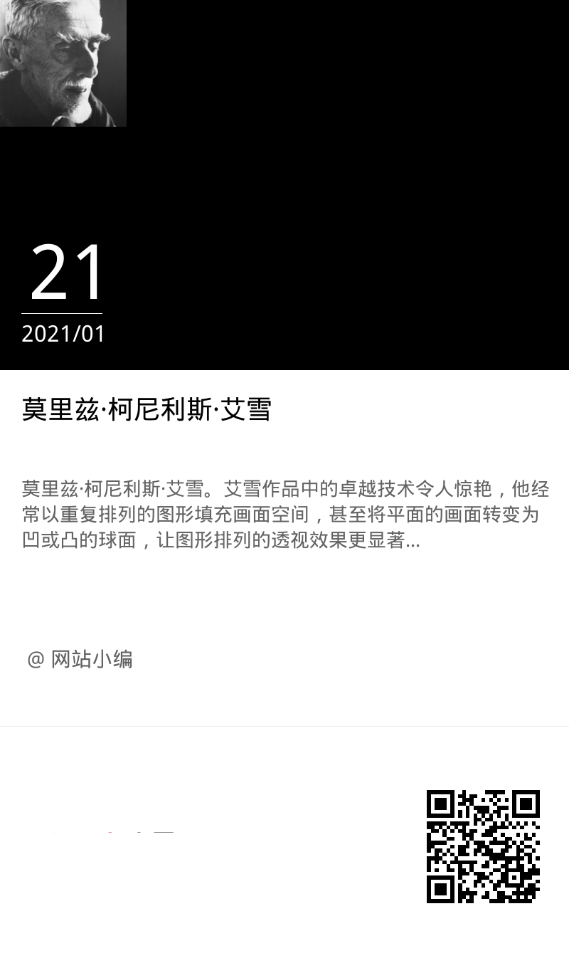 莫里兹·柯尼利斯·艾雪(或译为埃舍尔、艾薛尔)(Maurits Cornelis Escher)(1898年6月17日-1972年3月27日),为知名荷兰版画艺术家,其活跃于意大利、瑞士、比利时与荷兰地区60年间,也正好是欧洲历史上充满混乱与革命的时代。艾雪作品反应出幽微的内心世界,也是他对于当时历史的反思,也反映出他探讨宇宙秩序奥密的渴望。艾雪的版画技术卓越,足以充分善用不同技巧的优点。他以明显的黑、白色对比与精准的线条刻划,树立了与众不同的版画风格;他也创造演绎出复杂奇幻的变形结构,颠覆了自然的规律。艾雪作品中的卓越技术令人惊艳,他经常以重复排列的图形填充画面空间,甚至将平面的画面转变为凹或凸的球面,让图形排列的透视效果更显著。