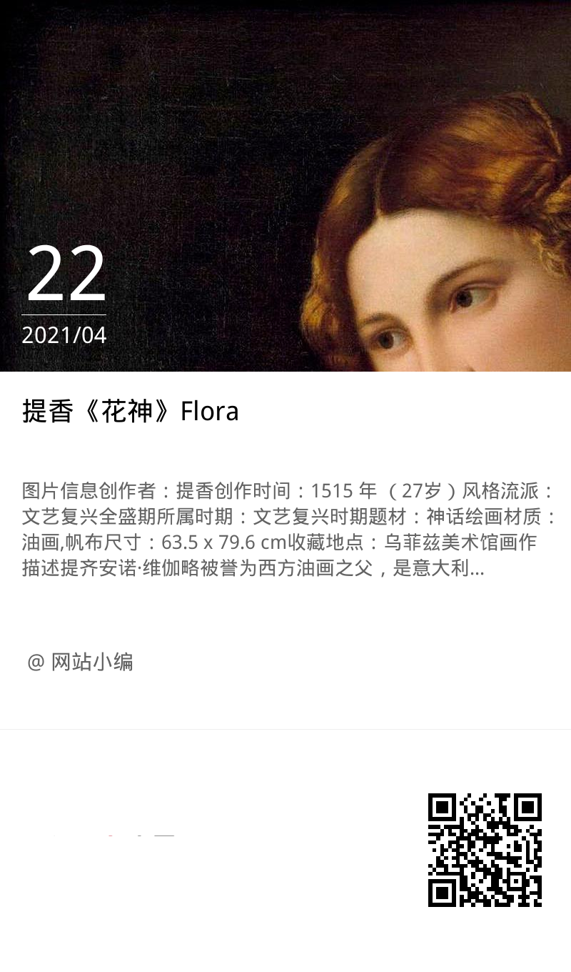 提齐安诺·维伽略被誉为西方油画之父,是意大利文艺复兴后期威尼斯画派的代表画家。在古罗马神话中,花神是智慧、美,也是爱情。每年4月28日至5月3日是意大利传统的花神节。在这六天里人们举行各种庆祝活动,用玫瑰装饰自己的一切,甚至是自己心爱的动物。花神在人们的心目中,是美满幸福的象征。提香的《花神》是一幅人物肖像画,画中女人手持花束,她转身俯视,目光专注,陷入沉思,宽松的衣服从左肩滑落,左手紧捏着衣服的一角,露出洁白的古罗马式内衣,金色秀发披散在肩上,给人以庄重典雅之感。据说画中的女人是提香当时的情人,提香借神话之名,来表达对情人的爱慕之情。提香也是借这幅画表达对中世纪禁欲主义的抨击,赞美女性人体之美。提香是一位色彩大师,他特别强调色彩的和谐,绘画笔触要服从于色彩与光线对比的需要,笔触不仅要刻画对象的质感,同时笔触的动态起着塑造形体结构和传达情绪的作用。